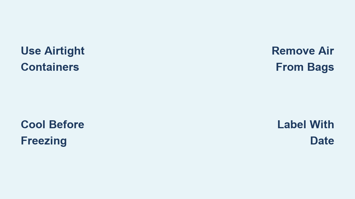 Vacuum sealing provides the most reliable method for long-term storage by preventing all air exposure. Without a vacuum sealer, double-bag freezer items with air pressed out of both bags. For containers, add extra protection by wrapping sealed containers in freezer paper.