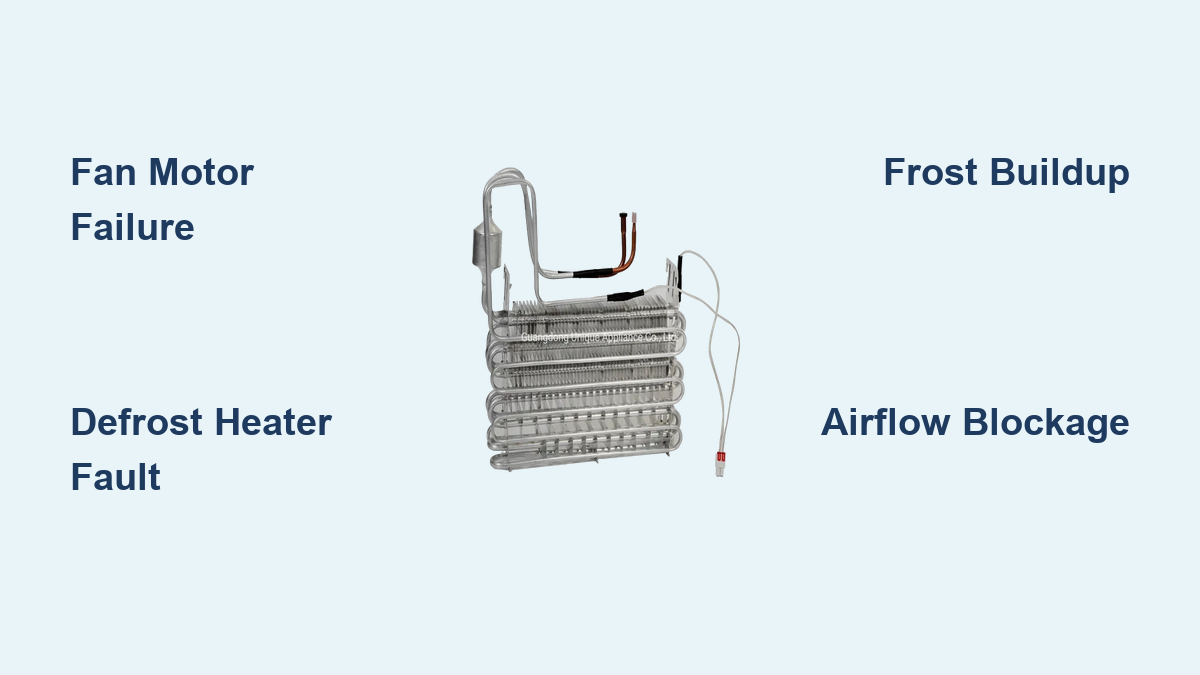 The evaporator fan motor is the most frequent cause of evaporator system failure. This motor runs continuously to circulate cold air across the evaporator coils and throughout the freezer compartment. Over time, the motor bearings wear out, the motor windings fail, or debris accumulates around the fan blades, causing the motor to labor and eventually stop working entirely.