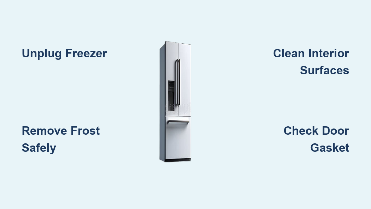 Unplug the freezer completely—don’t rely on control panel settings alone—to prevent accidental startup during cleaning. If your model has an internal drain plug (typically at the bottom rear), place your shallow pan directly beneath it. Remove all shelves and drawers, noting their positions with quick smartphone photos if needed. For models with ice makers, press the shut-off button or lift the sensor arm to prevent automatic ice production during cleaning. This preparation prevents 90% of common cleaning mistakes that lead to damaged components or spoiled food.