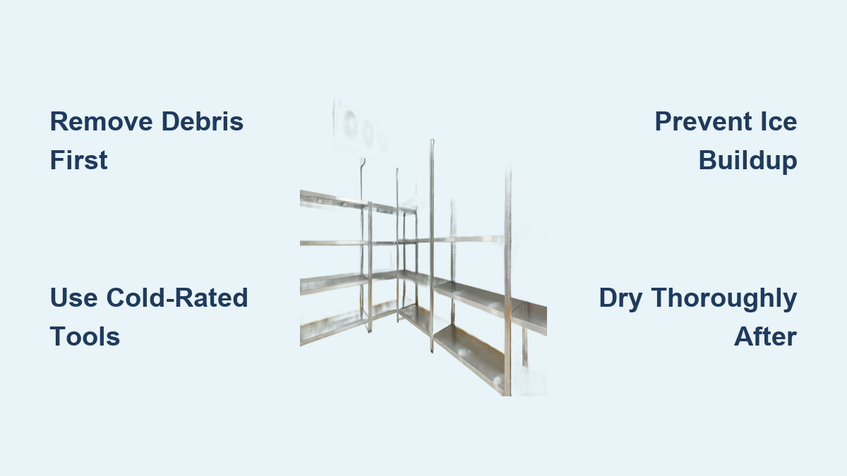 Thoroughly sweep the entire floor with your cold-rated broom, paying special attention to corners, under shelving units, and around door thresholds where frost accumulates most heavily. For significant ice buildup, use a plastic scraper (never metal, which can damage flooring) to remove large chunks before applying liquid solutions—this prevents spreading ice fragments across the floor during wet cleaning. Critical safety note: Always wear slip-resistant footwear rated for sub-zero temperatures during this preparation phase to prevent falls on icy surfaces.