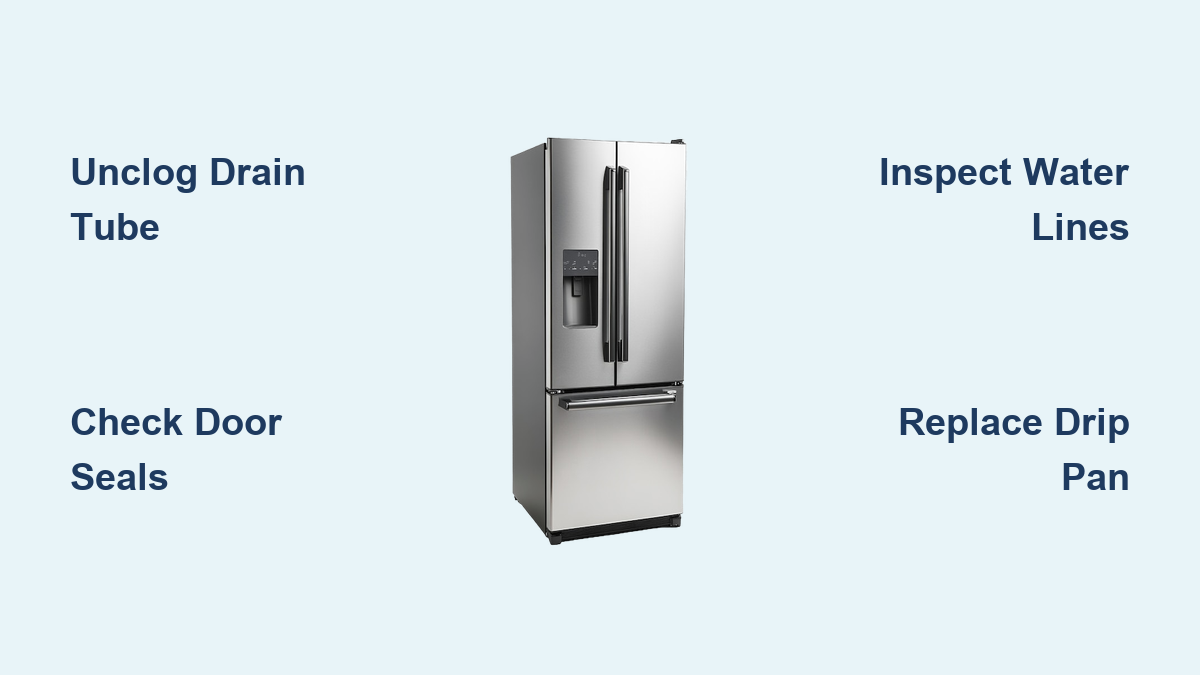 The drip pan collects defrost cycle water beneath your refrigerator, while the defrost heater melts accumulated frost. Damage to either component causes leaks that mimic other issues.